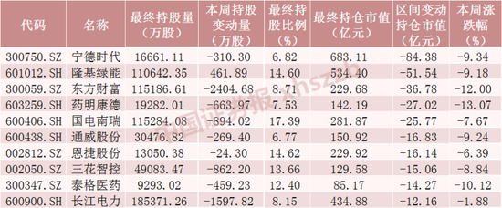 从持仓市值变动情况来看,本周北向资金对44只股票的持仓市值减少超过5亿元,对宁德时代、隆基绿能、东方财富持仓市值减少金额居前,持仓市值分别减少84.38亿元、51.54亿元、36.78亿元。