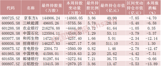 Choice数据显示,本周北向资金共计减仓983只股票,对其中71只股票的减仓股数超过1000万股。减仓股数最多的京东方A被减仓1.49亿股,三峡能源、农业银行被分别减仓5755.56股、4444.08万股。