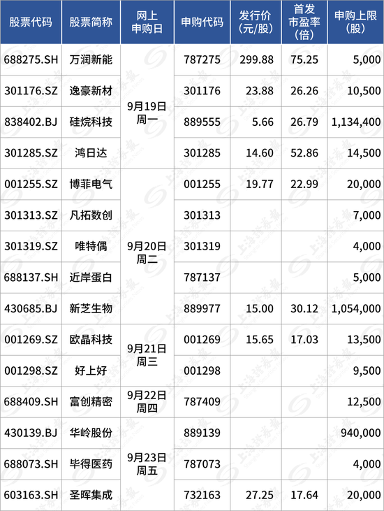 下周将迎来超级打新周,15只新股开启申购。拟于周一(9月19日)申购的万润新能是国内磷酸铁锂正极材料龙头,发行价为299.88元/股,中一签需缴款约15万元,一举超越华宝新能,成为今年以来发行价最高的新股,也是A股史上发行价第二高的新股。在已上市公司中,禾迈股份以557.80元/股的发行价位居第一,此前义翘神州以292.92元/股排名第二。