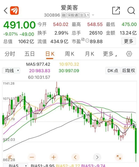 “医美茅”爱美客今日早盘放量跳水,盘中一度跌超11%,创近1年最大盘中跌幅。截至午间收盘,爱美客下跌9.07%。受此影响,医美板块全线杀跌,华熙生物、朗姿股份等纷纷重挫。