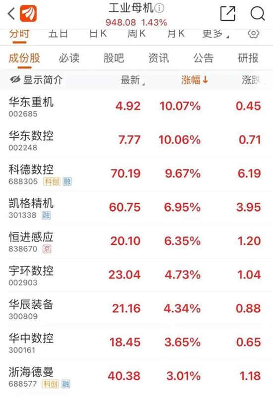 早盘,A股工业母机板块逆势拉升。截至午间收盘,华东数控、华东重机涨停,科德数控、凯格精机、华中数控等多股纷纷跟涨。