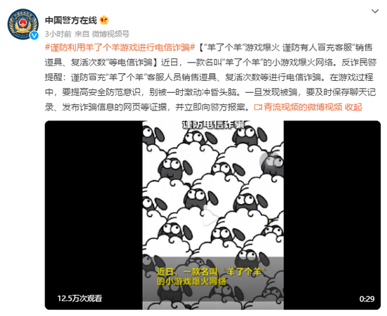 今日上午,公安部治安管理局官方微博“中国警方在线”表示,“羊了个羊”游戏爆火,谨防有人冒充客服“销售道具、复活次数”等电信诈骗。