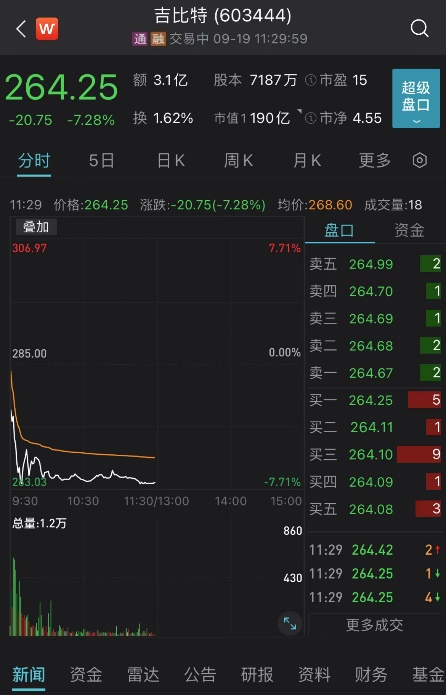 今日上午,吉比特下跌7.28%,最新市值为190亿元。