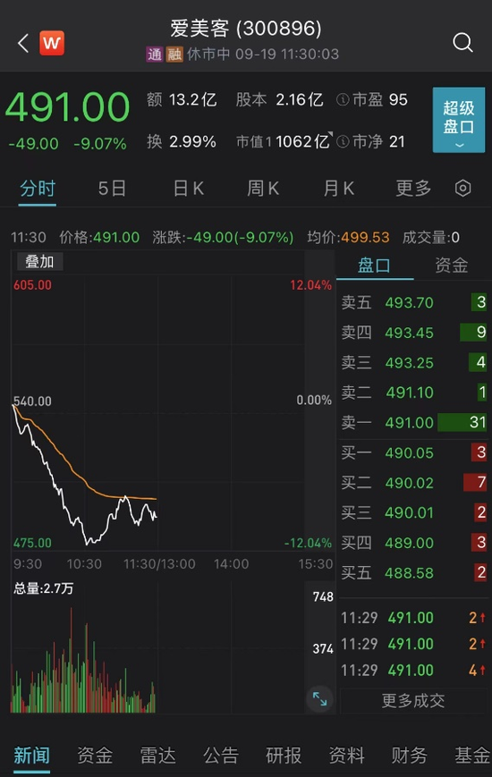 上午盘中,受市场传闻影响,医美板块明显回调,龙头股爱美客盘中跌超11%,截至午间收盘下跌9.07%,最新市值为1062亿元。