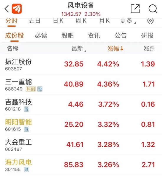 风电设备板块也表现活跃,三一重能涨超4%,明阳智能、大金重工、海力风电等涨幅居前。