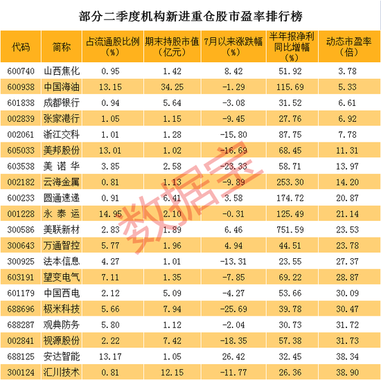 从期末持仓市值来看,次新股中国海油排名第一,8家机构二季度新进重仓19630万股,期末持股市值超过34亿元。其他个股方面,比亚迪二季度获社保一一四组合新进重仓700万股,期末持股市值超23亿元。此外,纳芯微、新洁能、汇川技术、拓荆科技-U、昱能科技等5只二季度机构新进重仓股期末持股市值均超过10亿元。