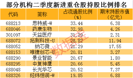 其中有32只为近一年上市的次新股。其中上市日期最近的是中无人机,为6月29日,有4家机构新进重仓,期末持股市值超过3.86亿元。此外,龙芯中科、慕思股份、三一重能等个股为今年6月上市次新股。