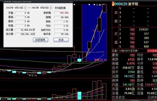 9月20日,热门股新华联再度涨停,截至收盘,报3.99元,实现5连板,累计涨幅达60.89%。