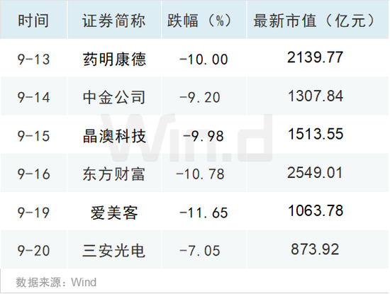 本轮调整中无论是传统大蓝筹还是赛道新能源等都有所下跌,而且市场风格变换较快,市场每天“杀”一只大白马情景再现。Wind数据显示,自中秋小长假后,除了9月20日市场反弹,个股普涨下,大白马三安光电跌幅只有7.05%外,其余每天都有超千亿市值的大白马出现9%下跌,甚至是跌停或跌超过10%。