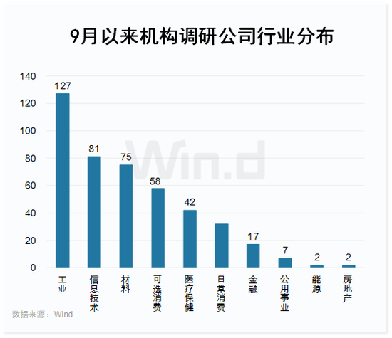 从9月以来机构调研方向来看,工业、信息技术、材料三大行业接受调研的公司家数均超70家,其中工业行业中接受调研的公司家数为127家居首,占比达28.67%,信息技术、工业行业则分别有81家、75家公司接受调研。可选消费、医疗保健、日常消费均有超30家公司获机构调研。
