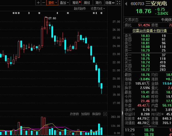 市场情绪面依然偏谨慎。LED芯片龙头三安光电早盘继续下跌,盘中一度跌超7%。昨日盘中有用户在网络平台发帖称,三安光电有相关人士中午在办公室被带走。此外,坊间还有关于“机构认为当前参与公司定增的价格太贵”的声音传出。昨日晚间三安光电发布澄清公告称,“三安光电有相关人士中午在办公室被带走”报道不属实。