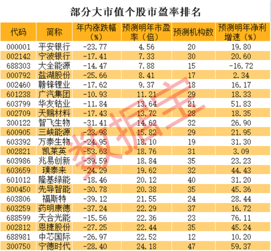 数据宝统计,调高业绩预期机构数超过调低机构数5家以上的个股中,有22只个股机构预测明年市盈率在30倍以下且年内跌幅超过10%。从估值角度看,平安银行、宁波银行、大全能源、盐湖股份、赣锋锂业等个股机构一致预测明年市盈率均在10倍以下。