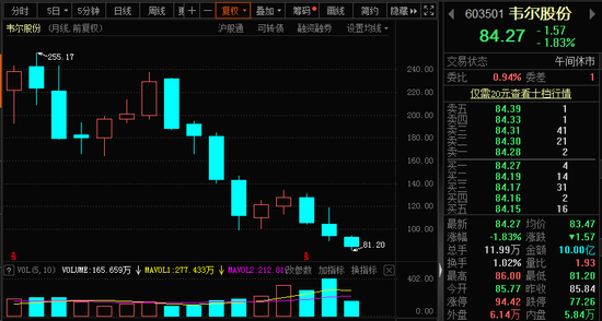 截至昨收盘,芯片龙头韦尔股份年内跌幅已经超过62%,该股去年底收盘价229.81元,昨收盘价85.84元,复权后跌幅62.57%。今年内该股仅5月、6月出现上涨,其它月份均为下跌,7月至今已连跌3个月。基本面来看,韦尔股份上半年营收111亿元,同比下降超11%;净利润22.69亿元,同比增长1.14%。