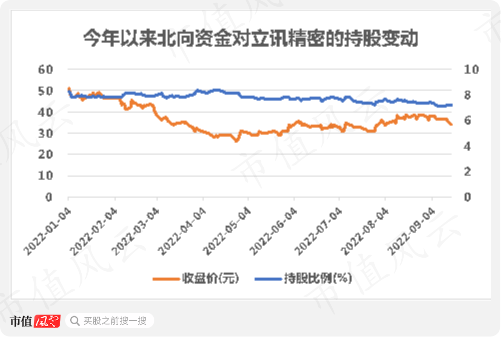 今年以来,北向资金对立讯精密的持股比例变动不大,虽期间股价跌幅较大,但北向坚定持有。截至9月16日,持股比例为7.2%,较年初仅下降一个百分点。