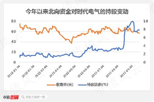 今年初至7月末,北向资金对时代电气没有太大的动作,但在8月对其大幅加仓,截至9月16日对其持股比例为7.8%,9月5日持股比例最高时达到10%。