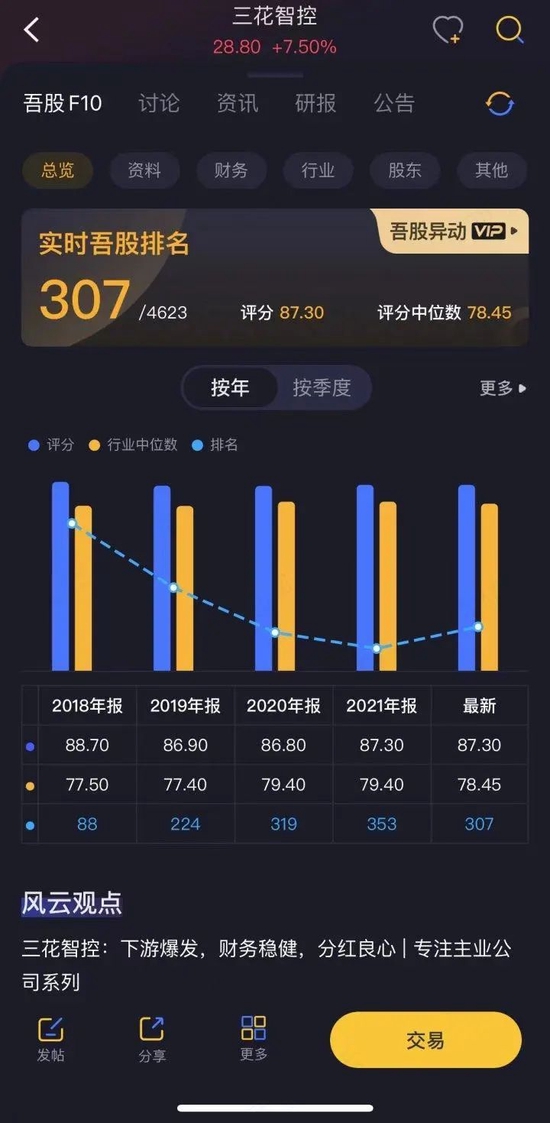 作为全球制冷元器件龙头的三花智控业绩表现不俗,中报显示上半年营收为101亿,同比增速32.4%,归母净利润10亿,同比增速21.7%,目前吾股排名为307,在A股中财务质量较好。
