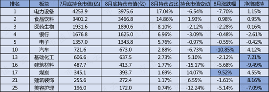 8月底北向资金持仓市值前五的板块合计1.2万亿,CR5仍在50%以上,前五大板块连续两个月下滑,8月平均跌幅为2%,仅消费板块的食品饮料实现微涨。