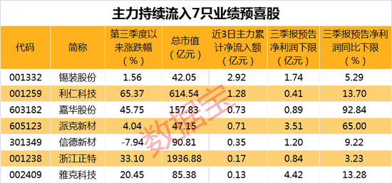 资金面上,7只业绩预喜股在近3个交易日获得主力持续净流入,锡装股份、利仁科技的主力累计净流入额居前,分别净流入2.92亿元和1.28亿元。