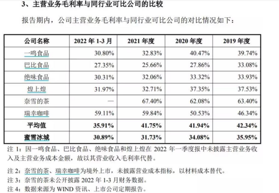 对此,蜜雪冰城解释称,报告期内,公司主营业务毛利率水平及其变动趋势,与经营模式相同的绝味食品、一鸣食品、巴比食品及煌上煌基本保持一致,符合行业特征;由于奈雪的茶为直营模式、瑞幸咖啡以直营模式为主,其收入为门店对外销售饮品等产品的收入,其营业成本仅含材料成本,因此其毛利率高于公司以及其他以加盟模式为主的同行业可比公司。