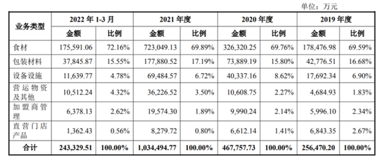 招股书显示,报告期内,蜜雪冰城收入主要来源于向加盟商销售各类制作现制饮品和现制冰淇淋所需食材、包装材料、设备设施、营运物资等产品,并提供加盟管理服务。其中,食材是最主要的收入来源,在今年第一季度的占比达72.16%。