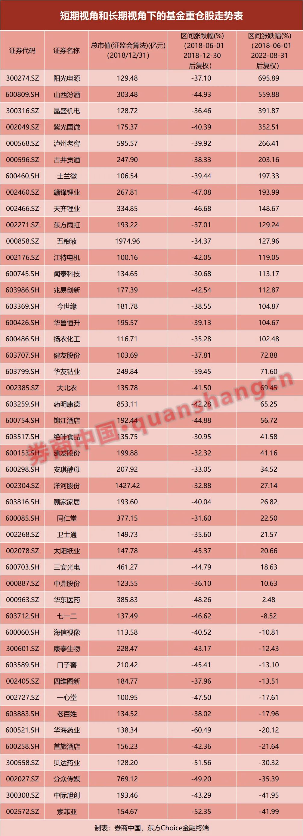 2018年下半年,相似的情景也曾在A股上演,东方雨虹、三安光电、五粮液、洋河股份、隆基绿能、扬农化工等基金重仓股跌幅均在30%以上。特别是在2018年10月份,智飞生物、山西汾酒、涪陵榨菜等个股均出现单月超过20%的跌幅。