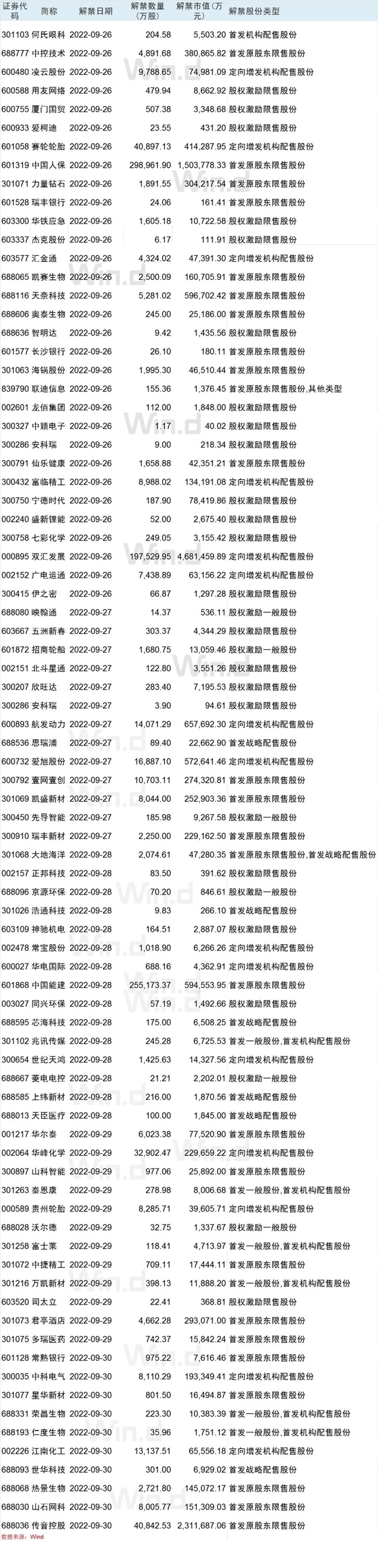Wind数据统计显示,9月26日-9月30日当周共有83家公司限售股陆续解禁,合计解禁量110.09亿股,按9月23日收盘价计算,解禁市值为1496.97亿元。