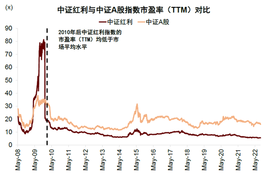 图表:2010年以后中证红利指数的市盈率(TTM)均低于市场平均水平,低估值的属性较突出