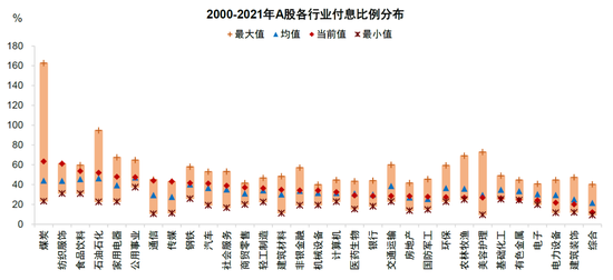 图表:2000年-2021年A股各行业的付息比例分布情况