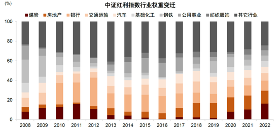 图表:2008年以来中证红利指数成分股的行业分布几经变迁,但综合来看主要以煤炭、钢铁为代表的周期板块,和以银行、房地产为代表的金融板块为主