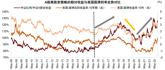 图表:A股高股息策略的相对收益同美国十年期国债利率的走势存在相关性,特别是在2016年后这一趋势较明显