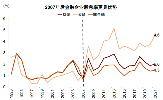 图表:2007年后A股金融企业的股息率更具优势,长期高于全市场整体与非金融企业水平
