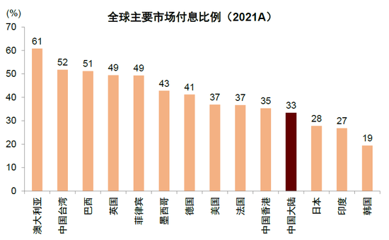 国际比较来看,中国上市公司的现金分红仍有一定的提升空间。受公司成长性、公司治理、投资者结构等诸多因素的影响,当前中国大陆上市公司付息比例和股息率在全球范围内仍有一定的提升空间。新兴市场中巴西、菲律宾、墨西哥等国上市公司的付息比例相对较高,发达市场中澳大利亚、英国、德国的付息比例较高。
