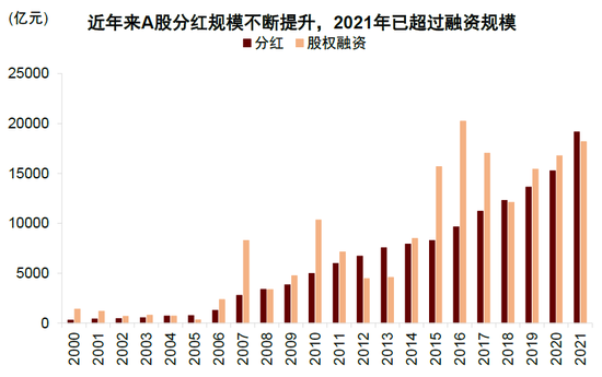 图表:近年来A股上市公司整体的分红规模不断提升,2021年接近2万亿,并超过总股权融资规模