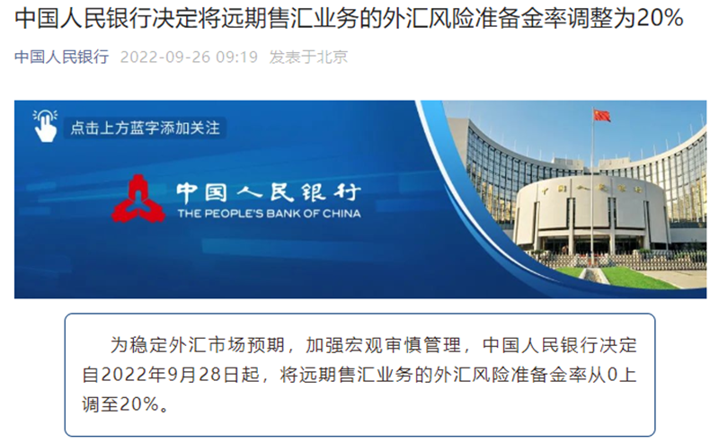 今日早盘,央行传来重磅消息。为稳定外汇市场预期,加强宏观审慎管理,中国人民银行决定自2022年9月28日起,将远期售汇业务的外汇风险准备金率从0上调至20%。受此提振,离岸人民币对美元短线拉升逾200个基点。