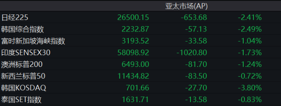 今日早盘,亚太股市普遍大跌。截至发稿,日经225指数跌2.41%,韩国综合指数跌2.49%。
