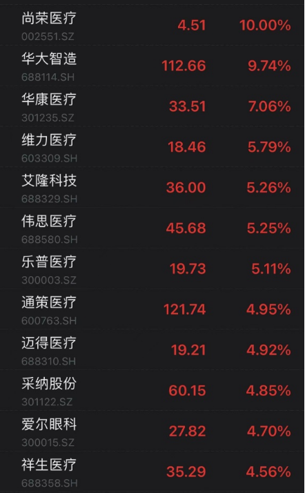 今日上午,医疗器械、医疗服务两大板块持续上涨,板块中尚荣医疗涨停。