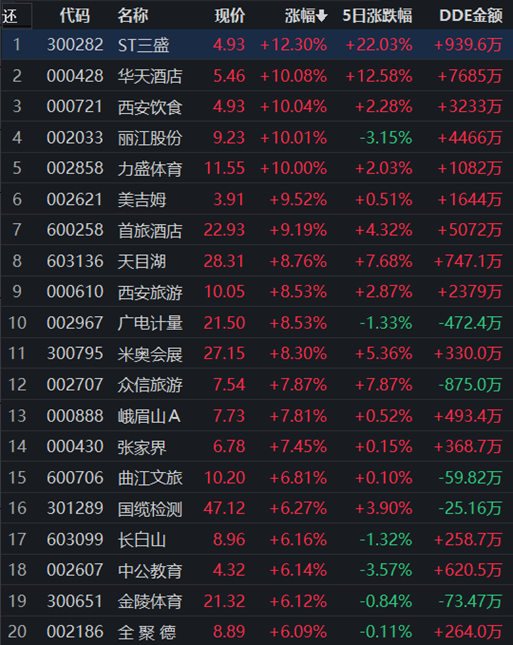 9月27日,申万一级行业中社会服务行业领涨,涨幅达5.33%。行业73只交易中的个股,有72只上涨,占比98.63%,其中,31只个股涨幅超5%。