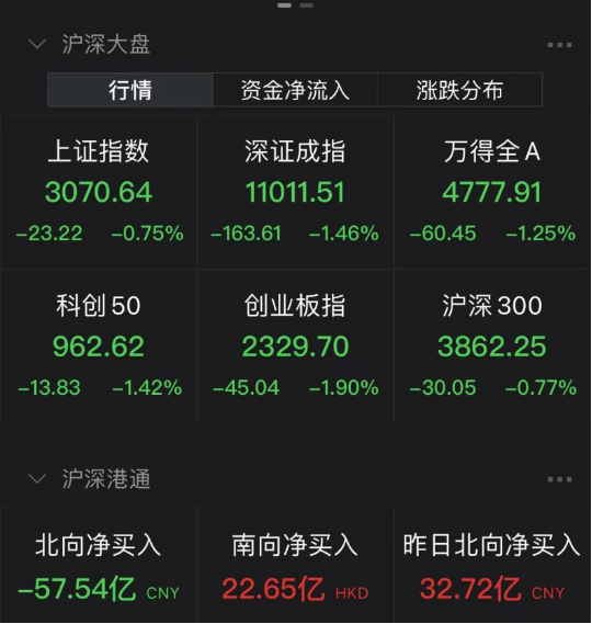 截至上午收盘,上证指数下跌0.75%,深证成指下跌1.46%,创业板指下跌1.9%。北向资金净流出57.54亿元。
