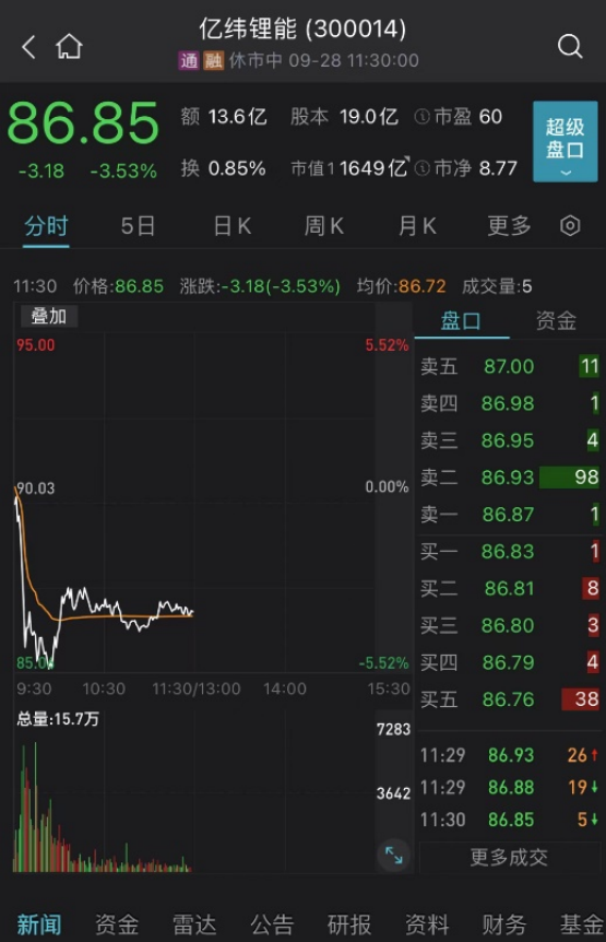 “锂茅”亿纬锂能下跌3.53%,总市值为1649亿元。