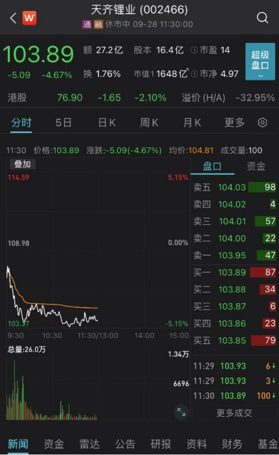 今日上午,A股锂电产业链调整幅度较大,多只千亿市值级别的个股大跌。锂矿板块中,西藏珠峰跌停,市值超1600亿元的“锂王”天齐锂业跌4.67%。