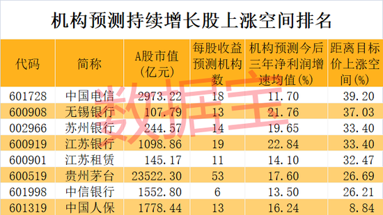上述低振幅抗跌股未来是否仍有增长潜力?数据宝统计,根据5家以上机构一致预测数据,8股今后三年获机构预测净利润增速均超10%。江苏银行获机构预测净利润增速均值22.84%排在首位。
