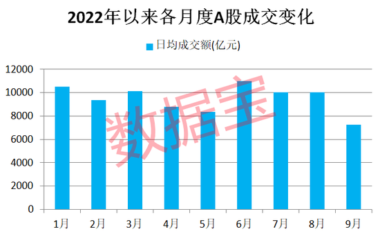 成交活跃度的下降侧面反映出投资者参与热情的变化。数据宝统计,今年以来A股日均成交额降至0.96万亿元,较2021年日均成交额下滑9.47%,是五年来首次下滑。刚刚过去的9月份,A股日均成交额降至7271亿元,为年度单月新低。在国庆节前最后一个交易日,成交额仅5616亿元,创下年内单日新低。