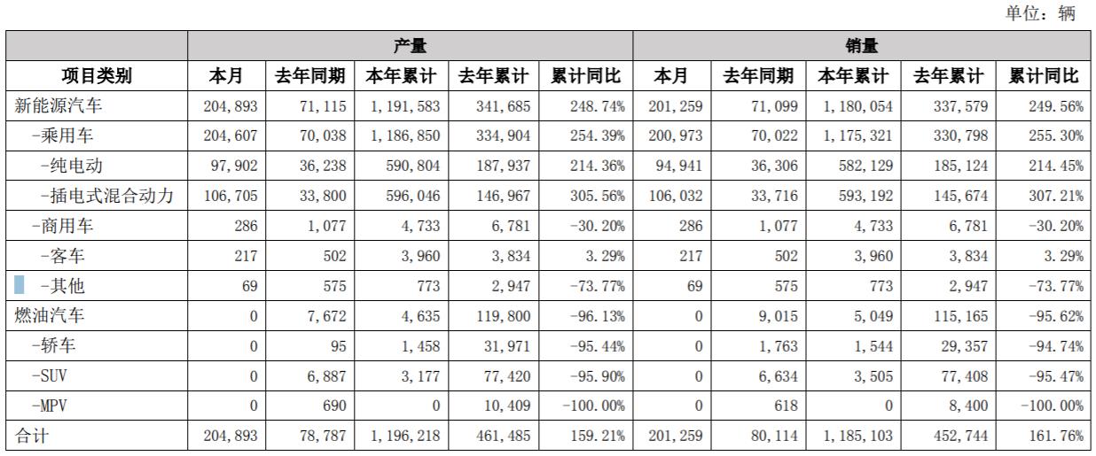 9月新能源汽车销量为201259辆,本年累计销量为1180054辆,累计销量同比增长249.56%。
