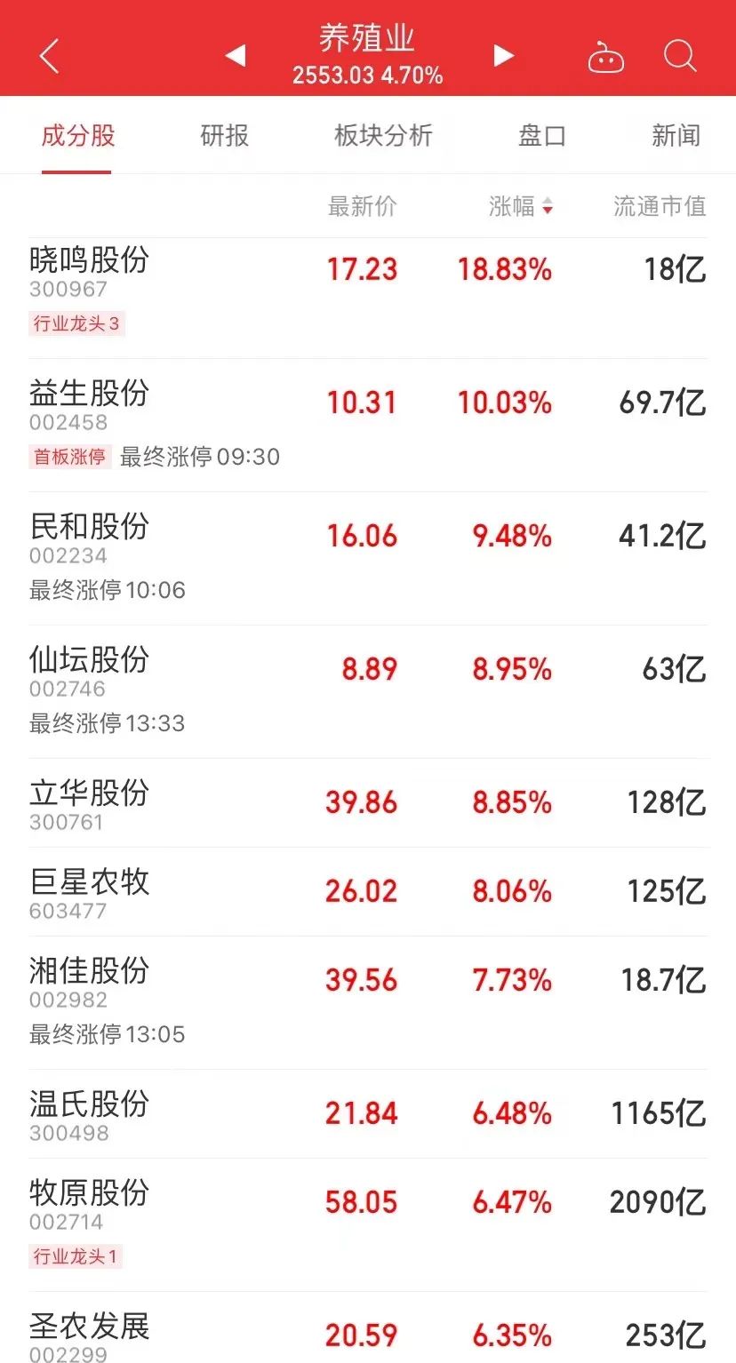 节后第一个交易日,A股养殖板块逆市大涨,截至收盘晓鸣股份大涨18.83%,益生股份涨停,民和股份、仙坛股份、立华股份、巨星农牧均大涨超8%,温氏股份、牧原股份涨幅均在6%以上。