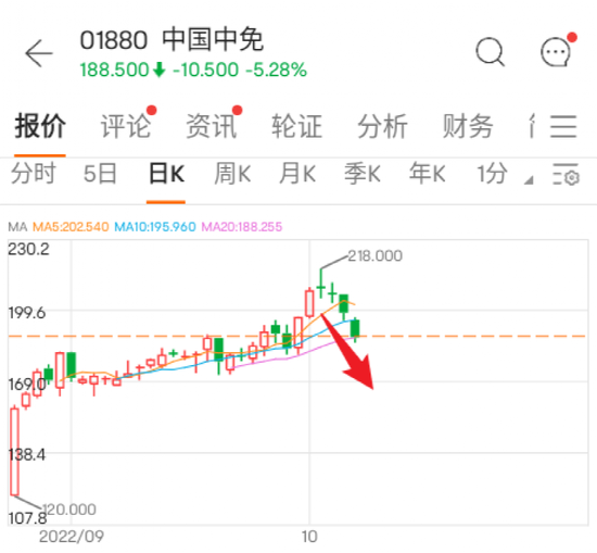 中国中免曾被市场给予期望并提前上涨,但10月5日创出上市来新高后,连跌4日,今日跌幅超5%。