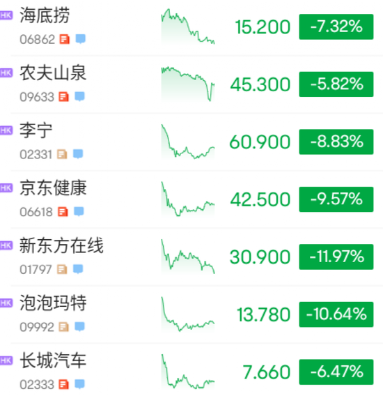 此外,食品饮料、体育用品、餐饮旅游、汽车等板块出现普跌,不少消费权重股今日跌幅居前,包括了泡泡玛特、新东方在线、京东健康、李宁、农夫山泉、海底捞、长城汽车等。