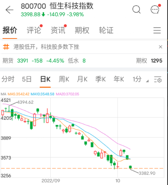 恒生指数今日大跌近3%,最近三个交易日,恒指连跌871点,几乎将10月5日的千点反弹回吐一空。恒生科技指数跌近4%,盘中创出3382点的新低。