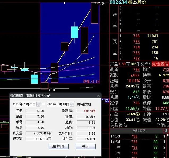 10月10日,热门股棒杰股份再度涨停,截至收盘,报7.36元,实现6连涨,其中,有3个交易日涨停,6个交易日累计涨幅达42.91%。