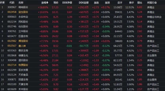 10月10日,农林牧渔行业涨幅居首,达3.35%。其中,晓鸣股份涨幅居首达18.83%,益生股份和永安林业(维权)等2只农业股联袂涨停。