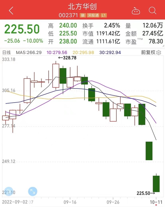 值得一提的是,北方华创(002371.sz)连续两日跌停。截至收盘,报225.50元/股,总市值为1191亿元。